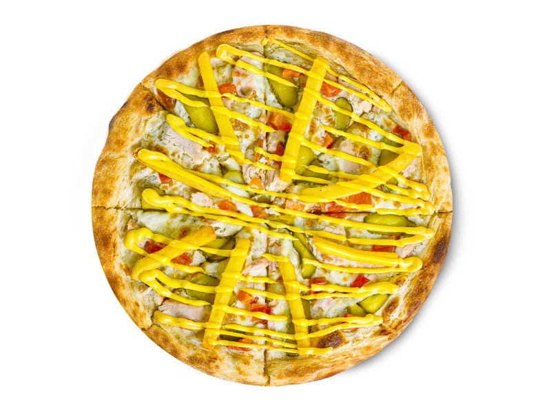 Тесто, соус белый сливочный, моцарелла, грудка куриная копченая, картофель фри, корнишоны, томаты, лук красный, лук зеленый.