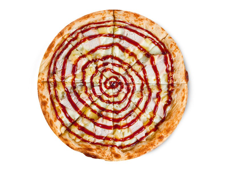 Тесто, соус белый сливочный, моцарелла, грудка копченая куриная, ананасы консервированные, соус барбекю.