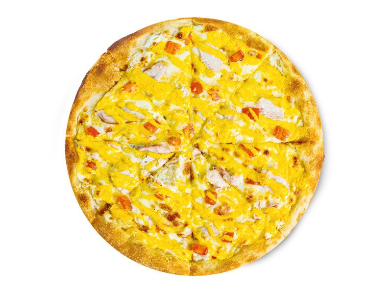 Тесто, соус белый сливочный, грудка куриная копченая, томаты, моцарелла, сыр чеддер, сыр пармезан, соус сырный.