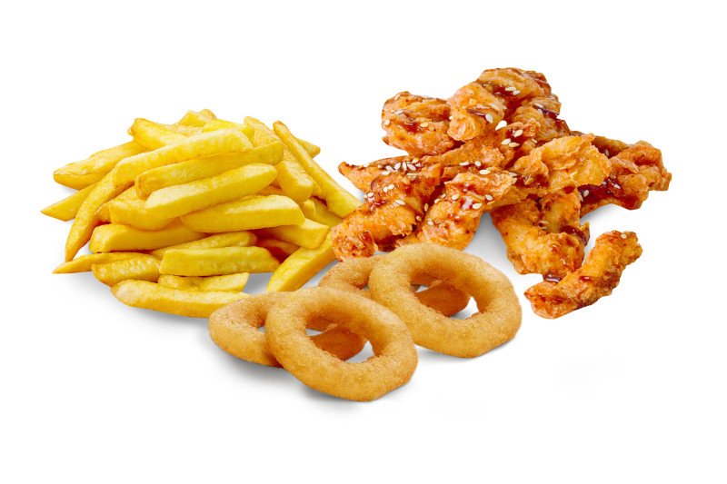 Луковые кольца, картофель фри, байтсы.