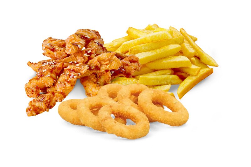 Луковые кольца, картофель фри, байтсы.