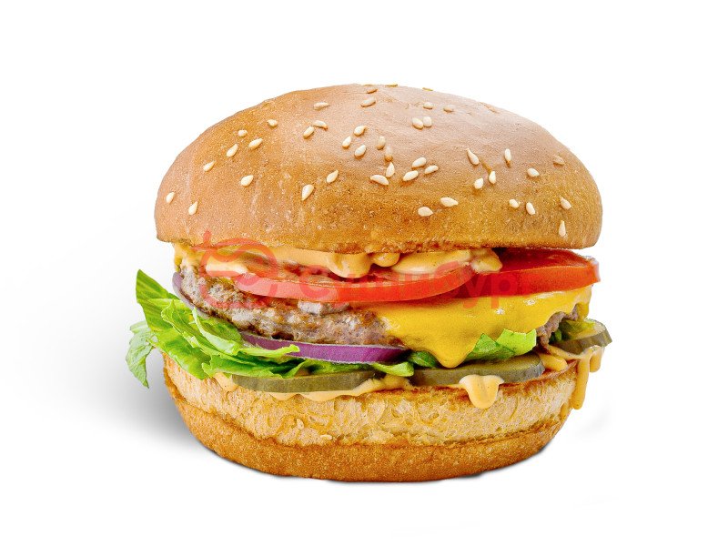 Булочка пшеничная с кунжутом, сыр чеддер, котлета мраморная говядина, томаты, корнишоны, салат айсберг, соус пикантный.