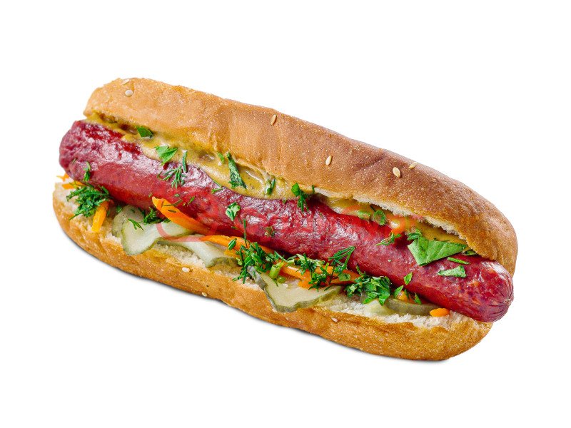 Булочка пшеничная, сосиска охотничья, корнишоны, морковь по-корейски, лук репчатый, зелень, горчица, соус пикантный.