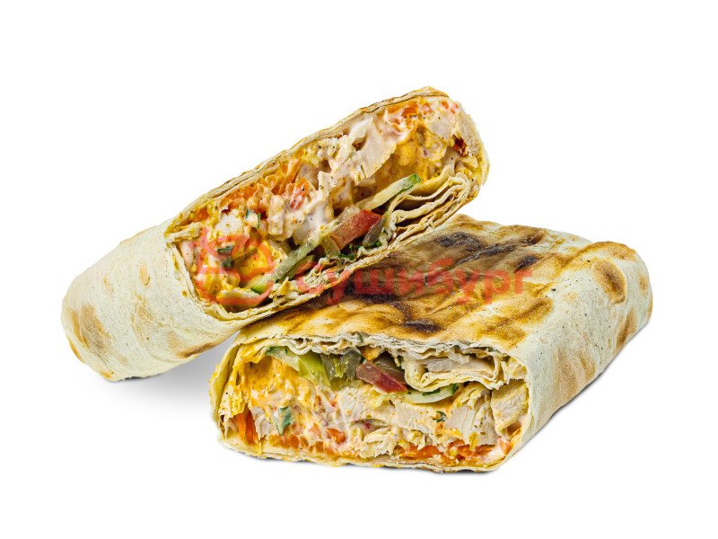Лаваш, томаты, огурец свежий, зелень, морковь по-корейски, лук репчатый, соус пикантный, филе куриное, халапеньо.