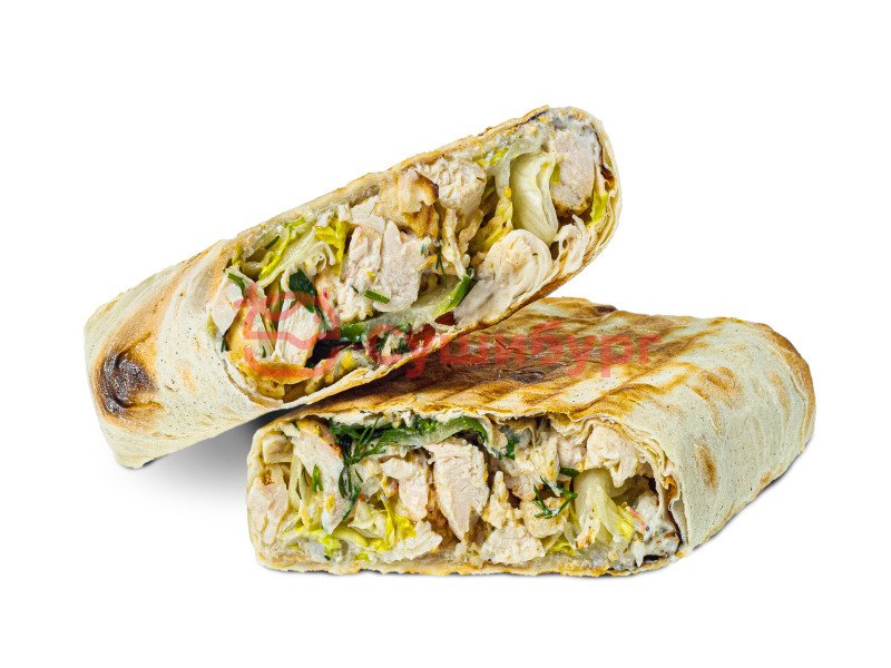 Лаваш, томаты, огурец свежий, зелень, салат айсберг, лук репчатый, соус на греческом йогурте с малосольными огурчиками, филе куриное.