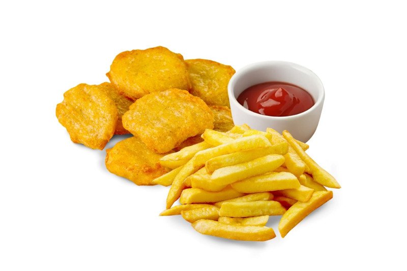 7 шт наггесты, 100 гр картофель фри, соус (на выбор).