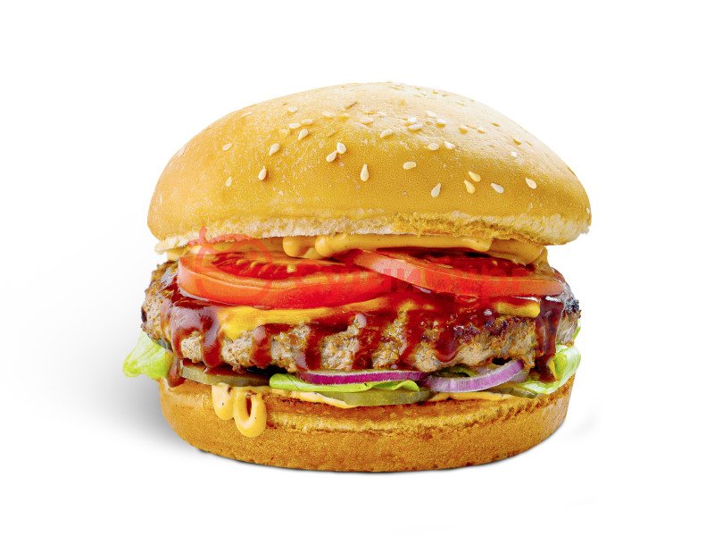 Булочка пшеничная с кунжутом, салат айсберг, томаты, корнишоны, лук красный, пикантный соус, сыр чеддер, котлета мраморная говядина.