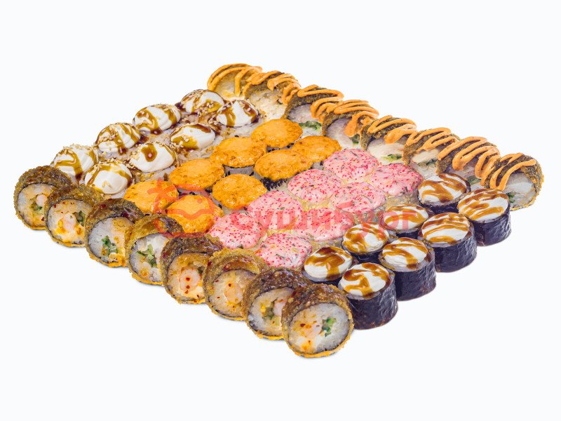 48 шт / Жареный с креветкой, жареный с куриным филе, запеченный с крабом, запеченный с лососем, холодный с куриным филе, холодный с крабом.