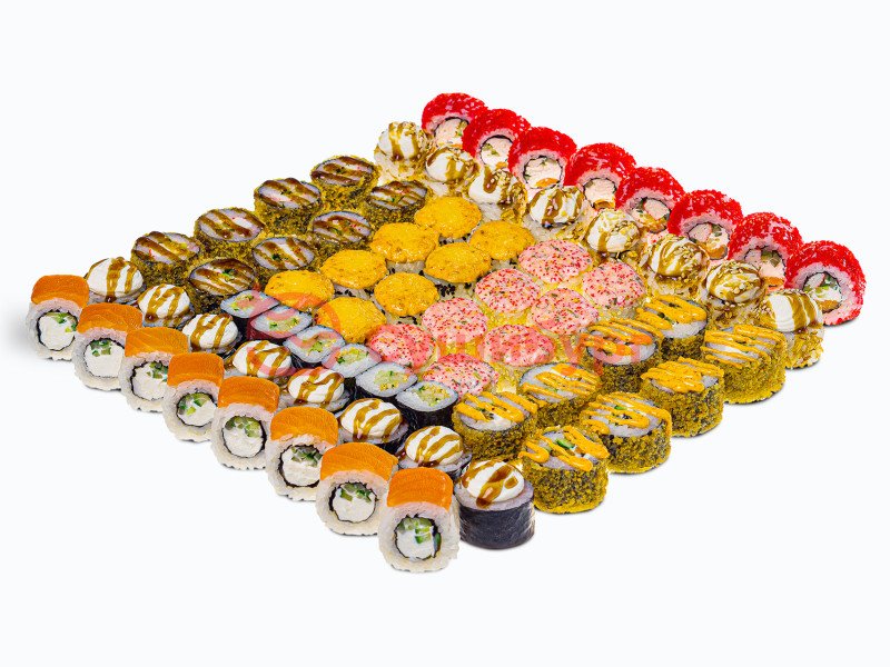 70 шт / Жареный с мидиями, жареный с крабом, запеченный с крабом, запеченный с лососем, холодный с куриным филе, холодный с крабом, холодный с лососем и крабом, холодный с лососем, классический с огурцом.